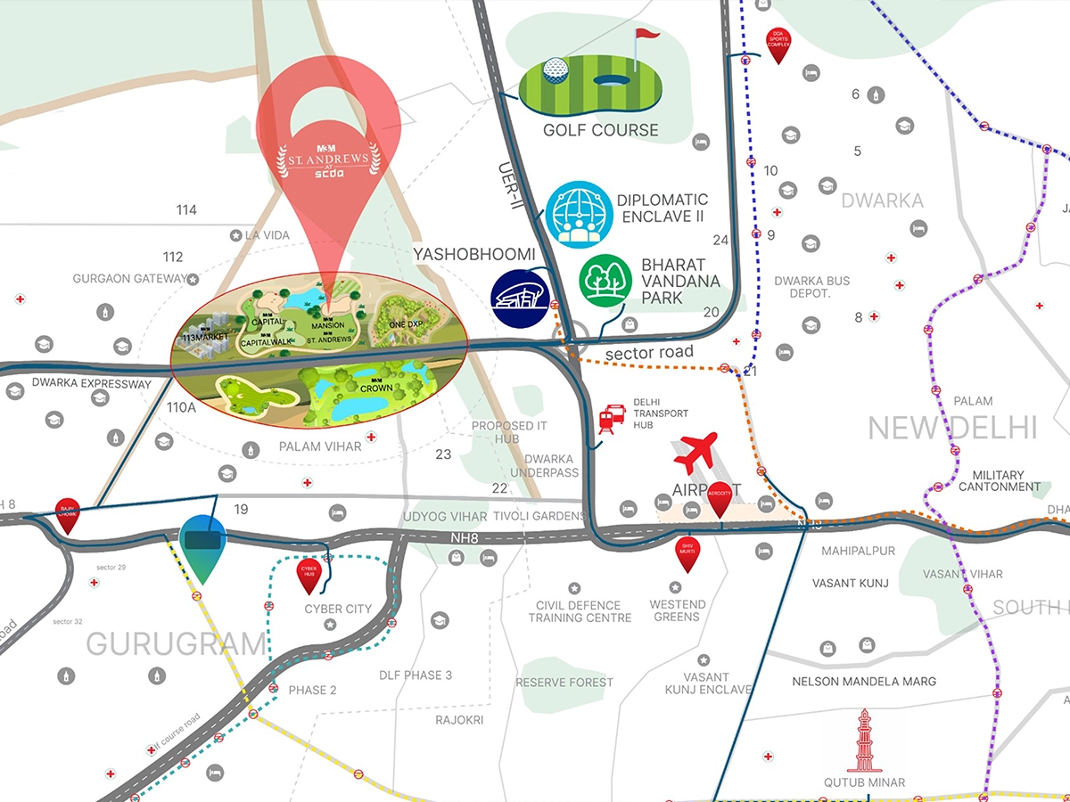M3M St. Andrews is an ultra-luxury residential project by M3M Group, strategically located in Sector 113, Gurgaon, close to the Dwarka Expressway and the SCDA (Smart City Delhi Airport) zone. This prime location places residents near one of the most promising urban developments in the NCR, ensuring excellent future growth and seamless connectivity to Delhi and IGI Airport.